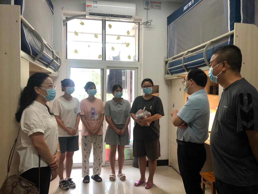 在公司静态管理期间,迎来了3天小长假,今年喜逢中秋节与教师节“双节同过”,同学们向老师表示敬意的同时,公司也为同学们送去关怀,让同学们感受到家的温暖。9月12日上午,公司党委书记李廷勇、伟德国际bevictor党总支书记唐晓萍、经理李俊、副经理向学春、副书记马婷等8人共同前往桂花苑4舍、5舍检查网格化管理情况并为同学们送去了慰问和关怀。