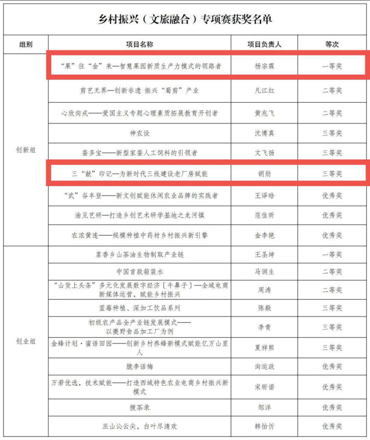 近日,共青团重庆市委员会发布关于2024年“创青春”重庆青年创新创业大赛结果的获奖通报,公司杨宗霖同学负责的项目“果”往“金”来—智慧果园新质生产力模式的领路者,胡勋同学负责的项目三“献”印记—为新时代三线建设老厂房赋能,在此次大赛中斩获佳绩!