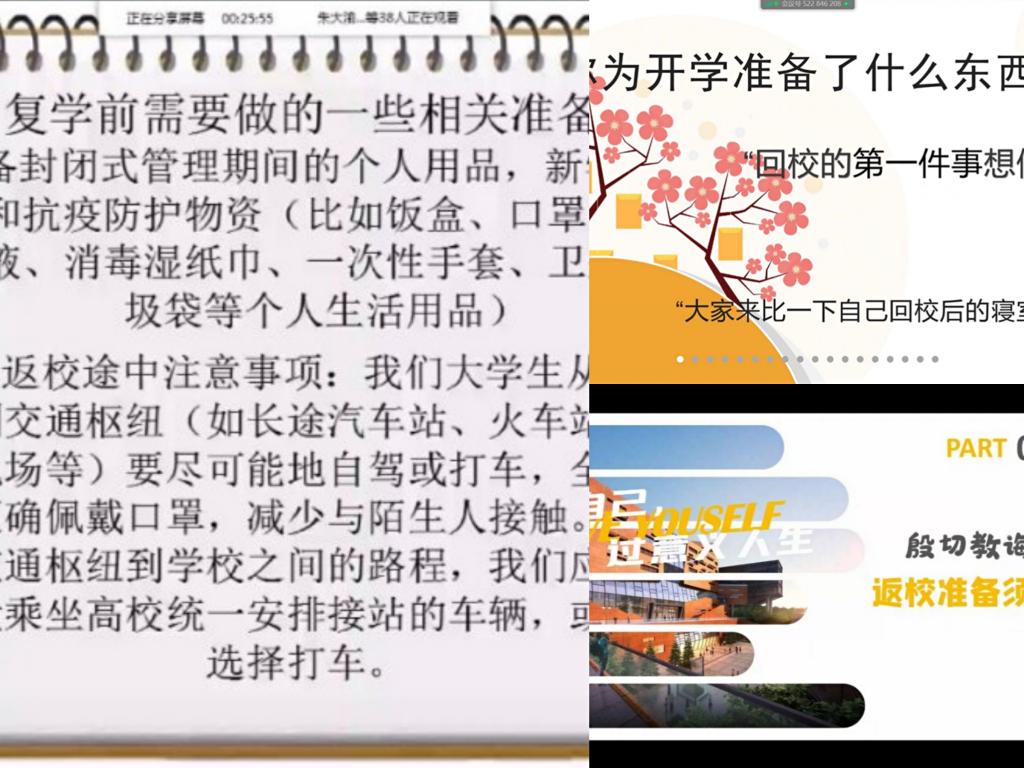 班会伊始,心理委员组织员工向逆行者们致敬,传递正确价值观。接着,针对员工经历了超长假期而返校在即的情况,心理委员提出员工应该反思自己在疫情期间的学习和生活状态,进一步提高学习积极性。同时,大家也积极分享假期的学习成果、心得体会。最后,心理委员从在家、途中、返校后等三方面提醒员工做好复学前的准备工作,强调员工要有安全防范意识,提高员工预防潜在危险的能力,并表示对开学充满期待。