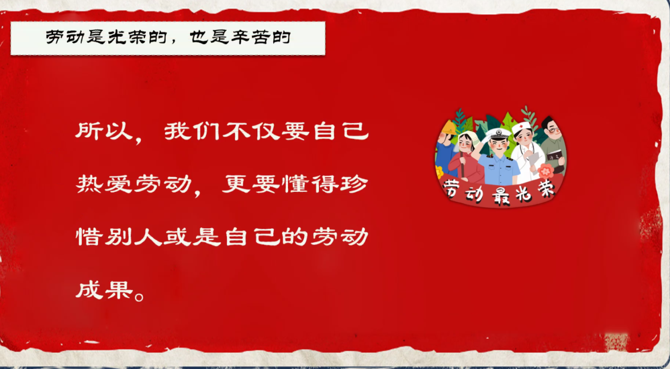 通过主题班会的开展,各班营造了尊重劳动的氛围,弘扬了积极的劳动精神,使同学们牢固树立了劳动最光荣、劳动最崇高、劳动最伟大、劳动最美丽的观念。