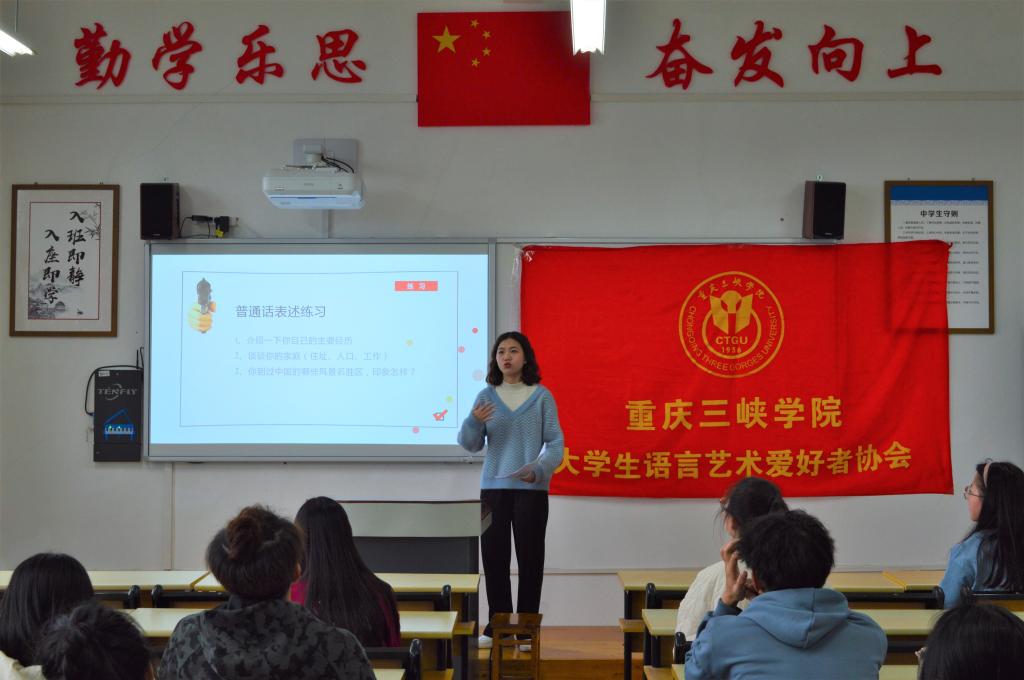 活动中,主持人向大家详细讲解了汉语的历史变迁。“雅言”“通语”“国语”等的变化,不仅使同学们体会到汉语的历史厚重感,也增强了同学们学习普通话的兴趣。针对川渝普通话中平翘舌不分的问题,主持人用视频的方式让同学们直观地了解到平翘舌的区别。随后,主持人讲解普通话水平测试评分标准。在练习中同学们积极参与,主持人积极指出大家存在的一些问题并提出建议。