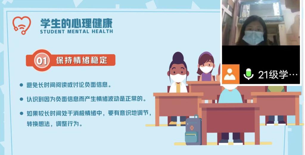 当前,重庆疫情形势仍然严峻。为减轻同学们疫情防控期间的心理压力、缓解同学们紧张焦虑的情绪,以积极乐观的心态迎接这一阶段的生活和学习,11月18日晚上8点,公司2021级学科教学(语文)1班与2022级学科教学(语文)1班联合举办了线上“心理健康”主题团日活动。