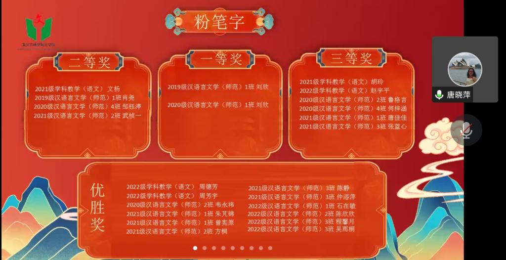首先,由唐晓萍书记、马婷副经理和向学春副经理分别公布大赛获奖名单,在祝贺获奖员工的同时,也勉励大家努力培养勤于律己的精神。其次,员工代表文杨讲述了自己学习三笔字的经历,以此激励同学们坚持练习三笔字。最后,李俊经理对此次三笔字大赛作总结,他提出公司师范生人才培养目标,即教师道德高尚、专业知识扎实、专业技能娴熟、符合行业标准,希望同学们用实际行动助推专业素养,把书法融入学习和工作中,形成学好、练好、用好三笔字的热潮。