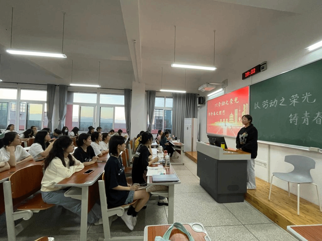 活动伊始,各班团支书组织同学们合唱团歌,顺利拉开本次活动的序幕。各班分别从讲解劳动精神,观看劳动楷模视频等开展活动。在优秀团员的详细讲解中,同学们深刻了解到劳动精神的内涵,强化了自身的劳动观念。通过放映视频,让同学们走进了劳动楷模的日常生活,亲历实际劳动过程,感受劳动的艰辛和快乐。各班团支书对活动进行总结,鼓励同学们在日常生活中积极劳动,发扬劳模精神,以劳动之光铸就青春理想。