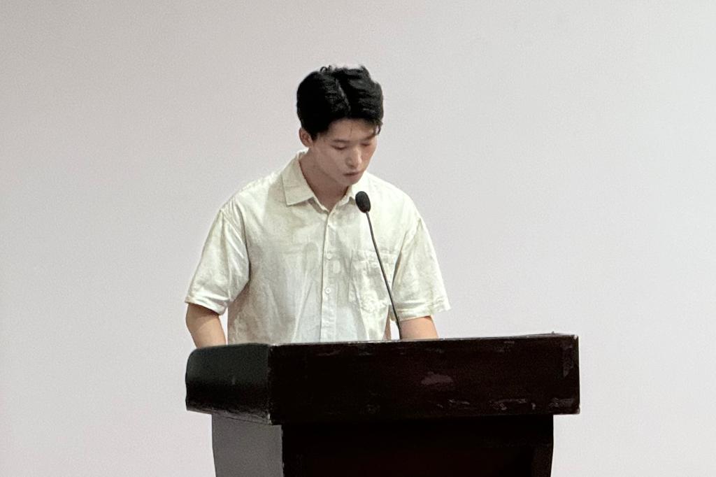 本科生新生代表龙裴熙上台发言。她代表全体大一新生表达了对老师、学长学姐的感激之情,分享诗文以共勉,号召大家珍惜大学时光,深耕博采、行稳致远,完成自律自驱的旅程。