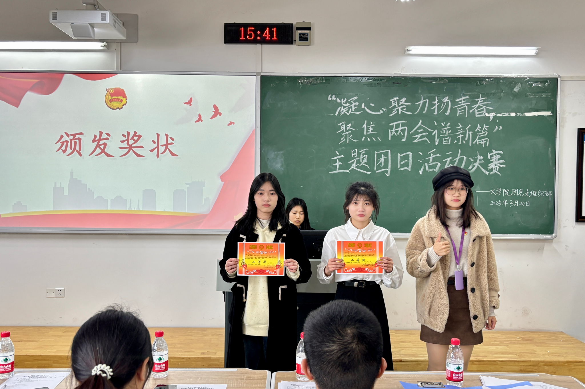 活动伊始,主持人张奕君向与会员工介绍了出席活动的嘉宾及入围决赛的选手。随后,全体人员起立,共同唱响共青团团歌。参赛选手们按照抽签顺序依次登台,围绕全国两会热点展开深入讨论。他们的演讲内容涵盖乡村振兴、医疗保障、教育改革、绿色创新等多个领域,结合自身所学专业与社会实践,阐述了对全国两会精神的理解与感悟。选手们以饱满的热情、生动的语言和详实的数据,展现了文院学子积极向上的精神风貌,赢得了现场观众的阵阵掌声。演讲结束后,组织部部长汤雨欣进行了总结发言。她对选手们的表现给予了充分肯定,同时也从演讲技巧、内容深度和互动效果等方面提出了具体建议,鼓励同学们在今后的演讲中加强与观众的互动,并借助PPT等多媒体手段,提升演讲的表现力与感染力。经过评委们的认真评审和综合打分,最终评选出本次演讲比赛的一、二、三等奖及优胜奖。四位嘉宾分别为获奖同学颁发了荣誉证书,对他们的优异表现表示祝贺,并鼓励全体同学以他们为榜样,持续关注国家发展,积极投身社会实践。
