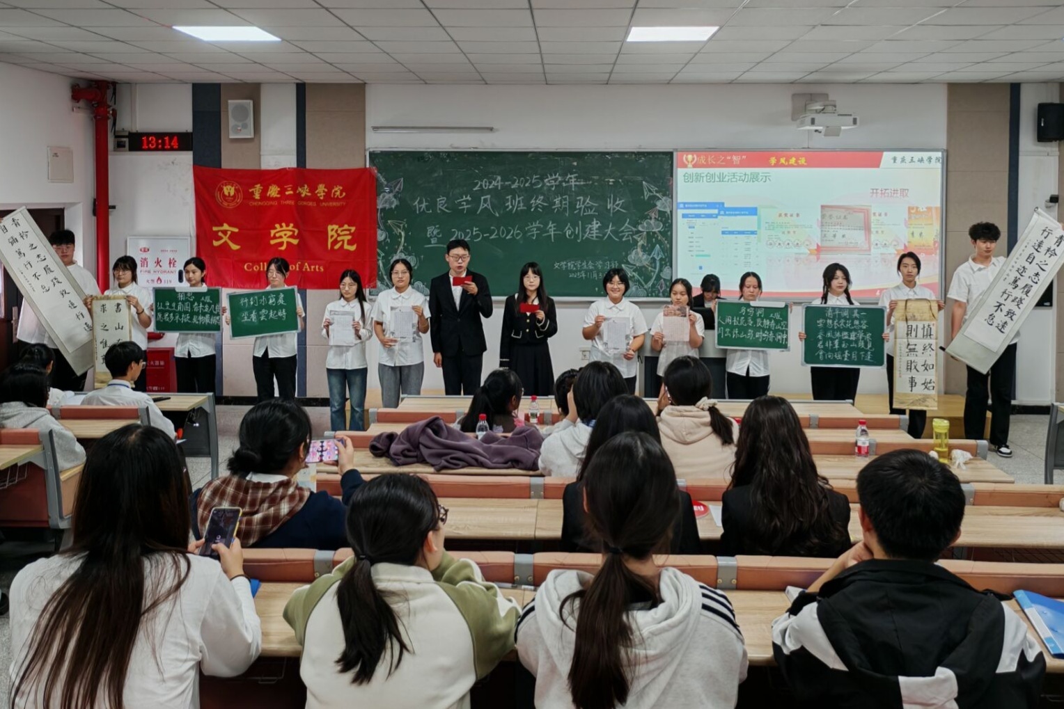 大会伊始,主持人介绍出席嘉宾以及本次会议的重要性。2023级各班代表以PPT的形式,围绕班级概况、思想建设、学风建设、班风建设、未来展望等多个方面进行汇报。首先进行汇报的是汉文二班,他们以“苔花如米小,也学牡丹开”自喻,展现了班级成员脚踏实地、心怀远方的精神风貌。随后,汉教一班的汇报者展示了班级同学扎实的专业基本功以及在各领域获得的证书、奖项,其综合实力与卓越表现令人瞩目。紧接着,汉教二班进行了精彩分享,他们介绍了班级制度,营造了井然有序的学习环境,同时,班级开展的模拟授课等活动也极大提升了同学们的教学实践能力,展现出了优良班风学风。之后,汉文一班以“好学向上”为主题,展示了班级独立运营的微信公众号,分享了班级同学参与乡村振兴助农直播带货的社会实践经历,体现了强烈的社会责任感。最后,汉教三班的压轴汇报,集中展示了班级在学业竞赛、文体活动等多方面的累累硕果,为此次验收活动画上了浓墨重彩的一笔,充分彰显了文院学子的卓越风采。