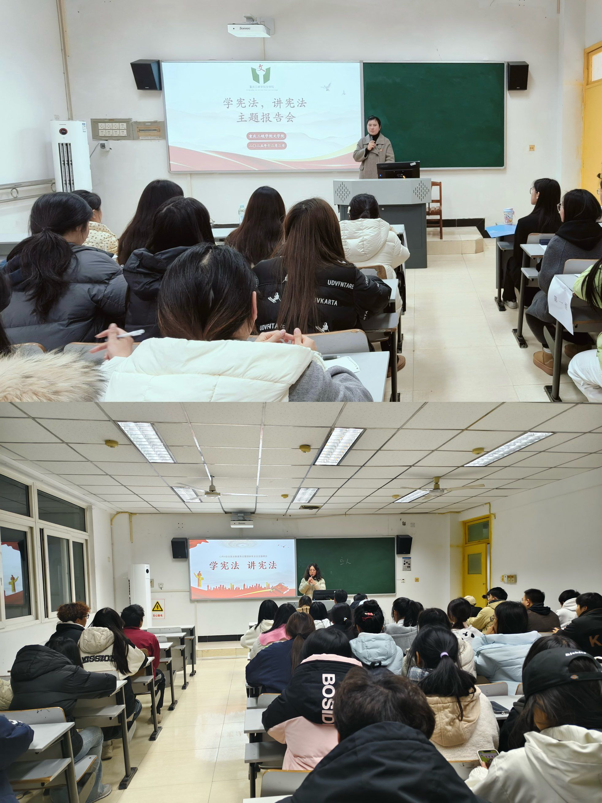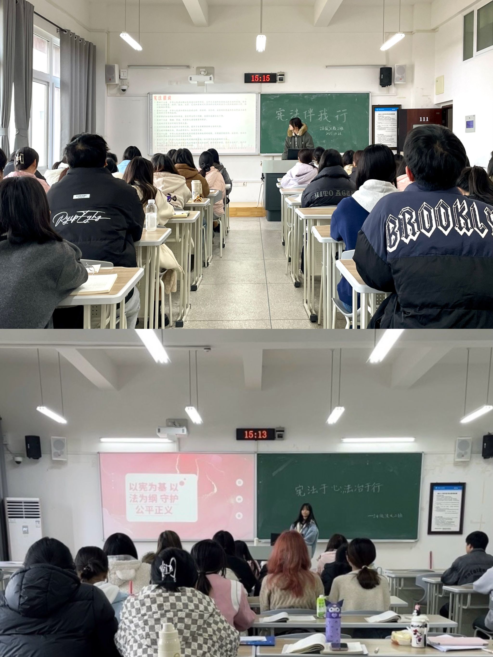 此次系列活动形式多元、内容充实,主要开展了宪法晨读、《宪法伴我行》歌曲传唱和宪法教育主题班会、主题报告会。在宪法晨读中,同学们精神饱满、声情并茂,从宪法序言到具体条款,逐字逐句诵读原文,将尊崇宪法、敬畏宪法的情感厚植于心。宪法教育主题班会上,各班通过典型案例剖析、法治视频展播、互动问答等多元形式,生动解读宪法核心要义,同学们积极分享学习心得,在思想交流中深化对宪法的理解与认同。