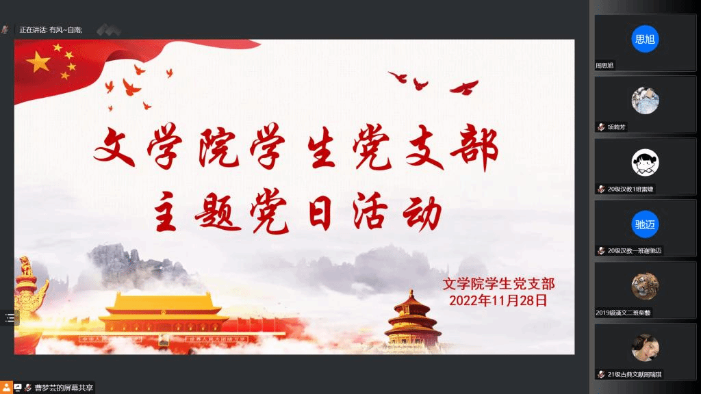 本次会议紧跟时事,着眼于习近平总书记在党的二十大报告中提出的关于生态文明的重要论述。学习视频选自国家专题纪录片《领航》中的《绿水青山》部分。在观看完学习视频后,同志们进行了热烈的讨论。胡嘉玥、张欣怡等同志就视频学习进行发言,表达自己的所想、所思、所感。