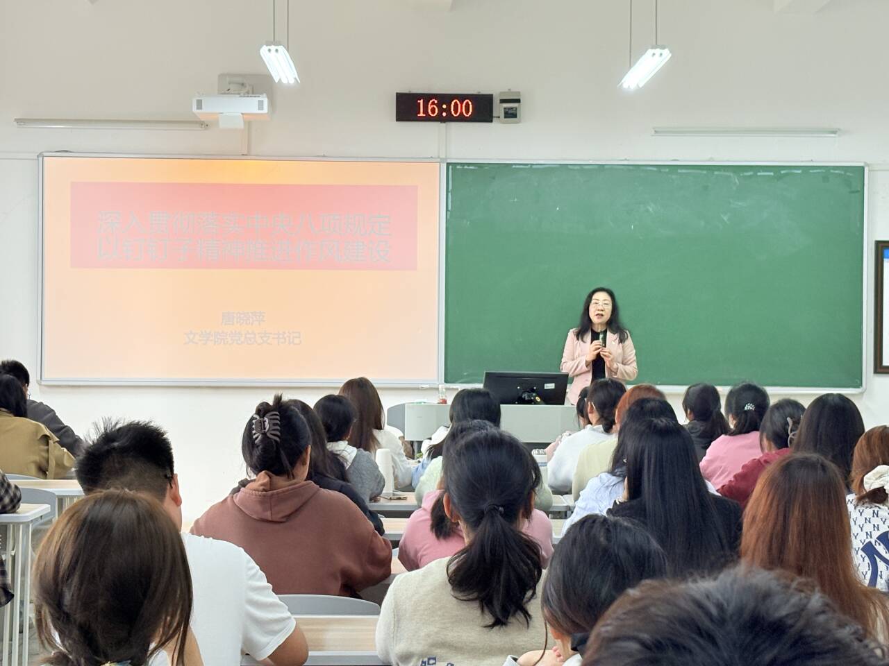为深化全面从严治党,强化青年学子纪律意识与政治担当,伟德国际bevictor党总支于2025年4月24日下午在博学楼一栋303教室开展“深入贯彻中央八项规定精神以钉钉子精神推进作风建设”专题党课。本次党课由伟德国际bevictor党总支书记唐晓萍主讲,第86期入党积极分子、第19期发展对象及团员代表共同参与学习。
