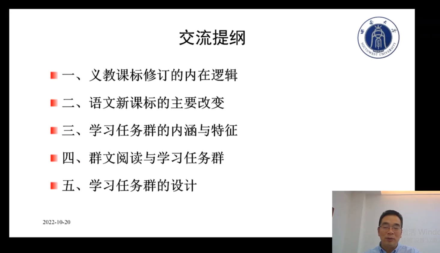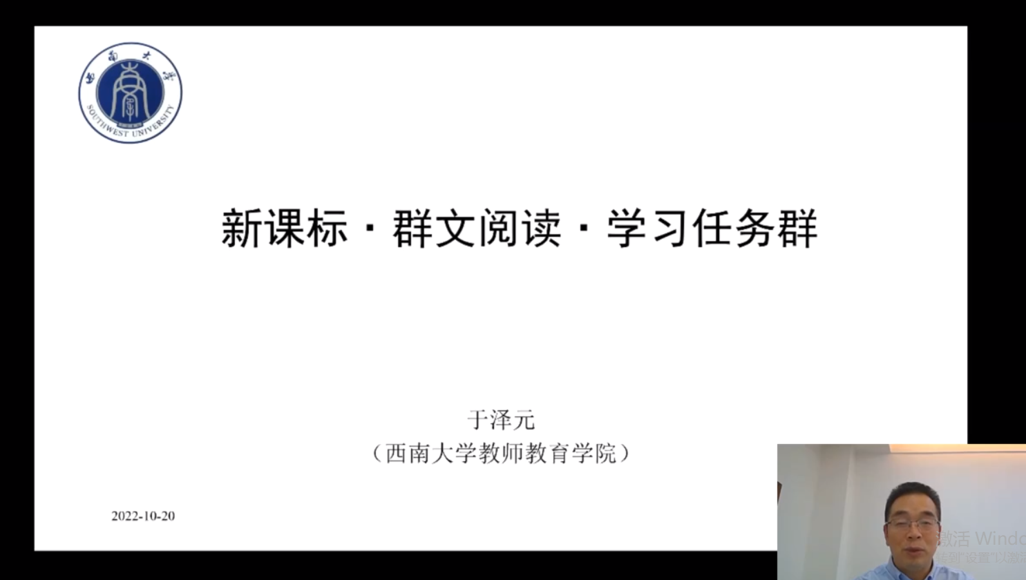 根据疫情防控的要求并方便更多学子得到名师的指引,本次课程在树人教育研究院的“任务学习-云智慧”平台进行线上“云”授课。于教授以高屋建瓴的学术视野为大家讲授以“新课标·群文阅读·学习任务群”为题的新课标背景下中小学语文教学发展趋势,内容共分五个板块,一是义教课表修订的内在逻辑,二是语文新课标的主要改变,三是学习任务群的内涵与特征,四是群文阅读与学习任务群,五是学习任务群的设计过程。在讲课的全过程,于教授都不断强调教师要“立德树人”,将知识学习转向到育人为本,以区别于传统的语文教学,强调现在的教育要帮助员工提升自我能力。同学们听后纷纷表示,要成为合格的教师,必须理解课程标准提出的新要求,而且要对自己的教学结构、教学设计还有学情的把握都要有一个新的思考,更要贯彻落实“立德树人”的标准,把自己的员工培养为有理想、有担当、有本领的时代新人。